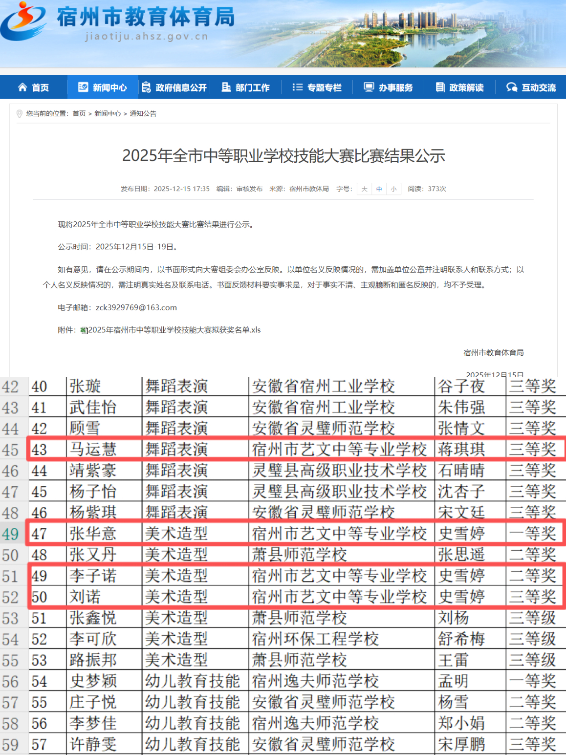 近日,2025年宿州市全市中等职业学校技能大赛比赛结果公示,我校师生凭借出色表现,在多个赛项中斩获佳绩。