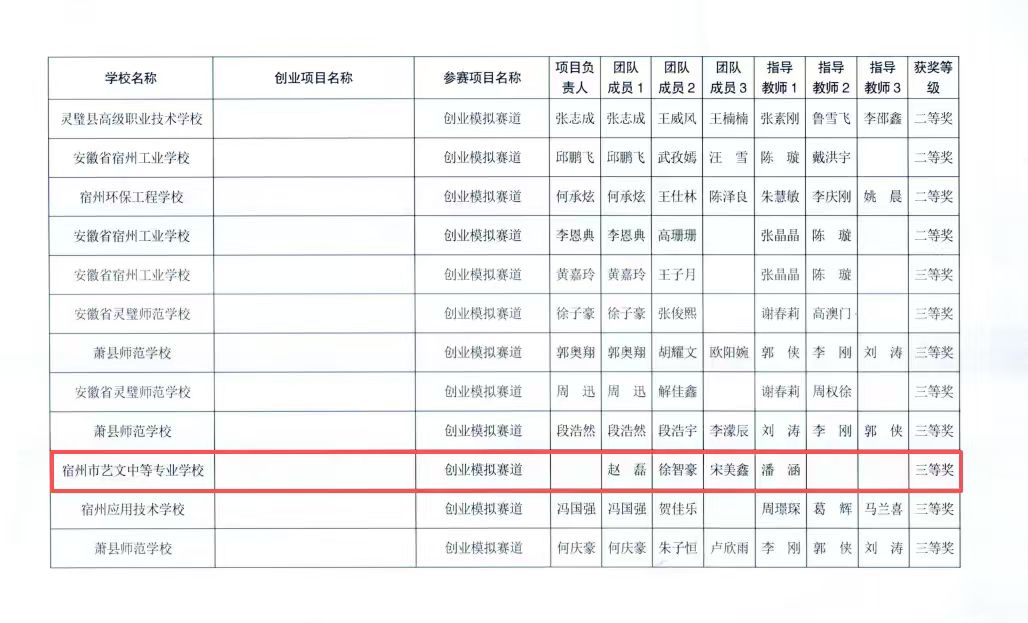 近日,2025年宿州市全市中等职业院校创业大赛比赛结果公示,我校赵磊、徐智豪、宋美鑫三位同学(指导老师:潘涵)凭借出色表现,在创业模拟赛项中荣获市级三等奖。
